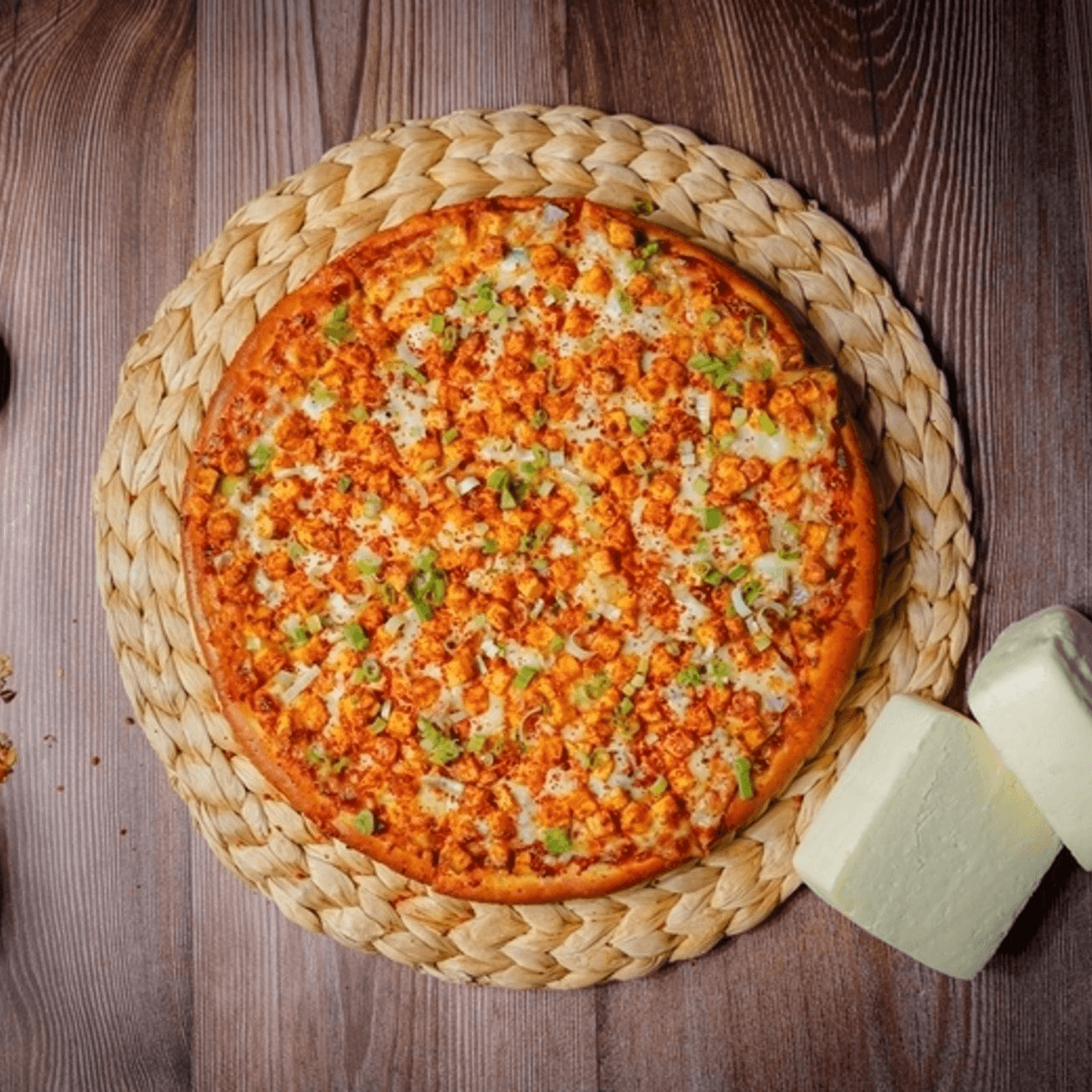 Spicy sauce, green pepper, onion, cheese, fresh jalapeno, spicy marinated paneer, green onion