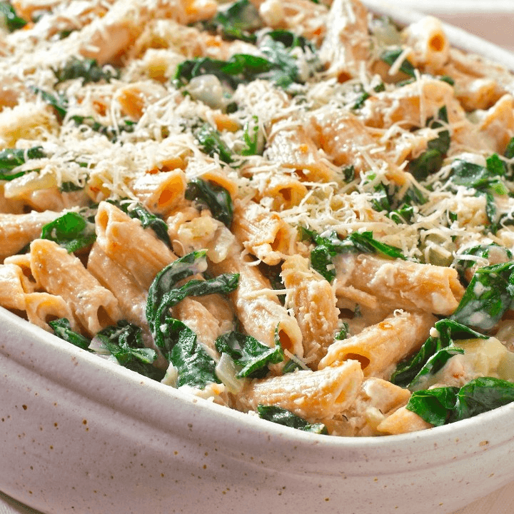 Penne with Pink Spicy Sauce, Spinach, Green Pepper, Onion, Black Olives, Fresh Garlic/N & Mozzarella Cheese