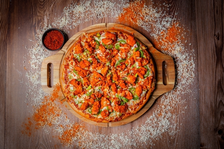Spicy sauce, bell peppers, onions, cheese, and marinated tandoori chicken.