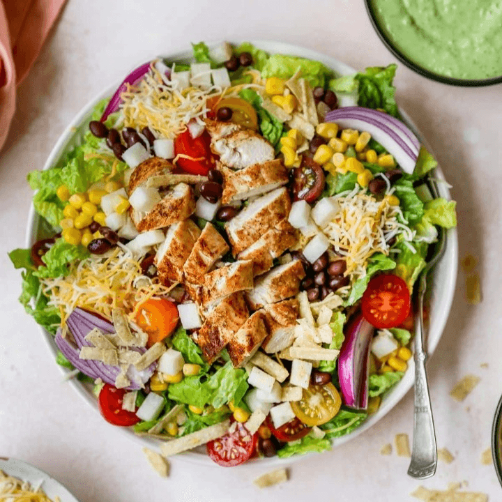 Roasted chicken, spicy green salsa, guacamole, onion, cheese, avocado ranch dressing.