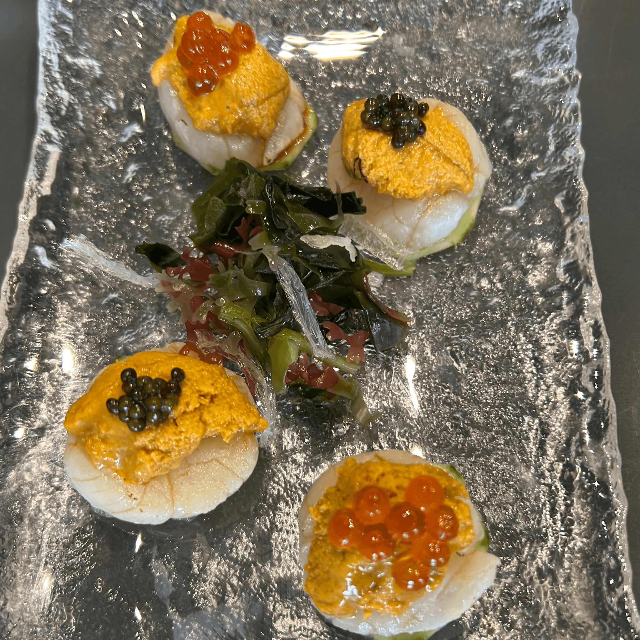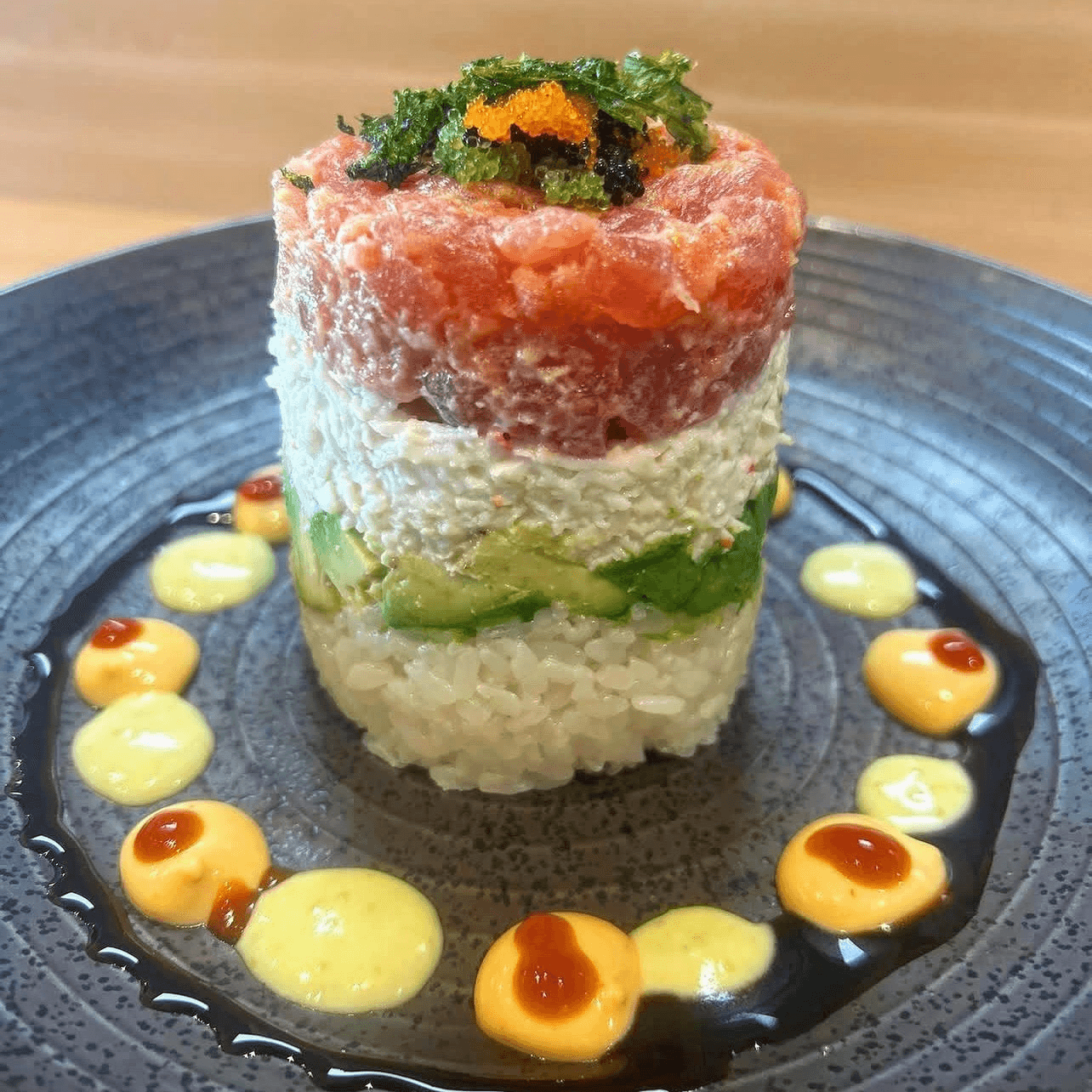 Kani, salmon, avocado, black tobiko, yuzu ponzu, truffle oil