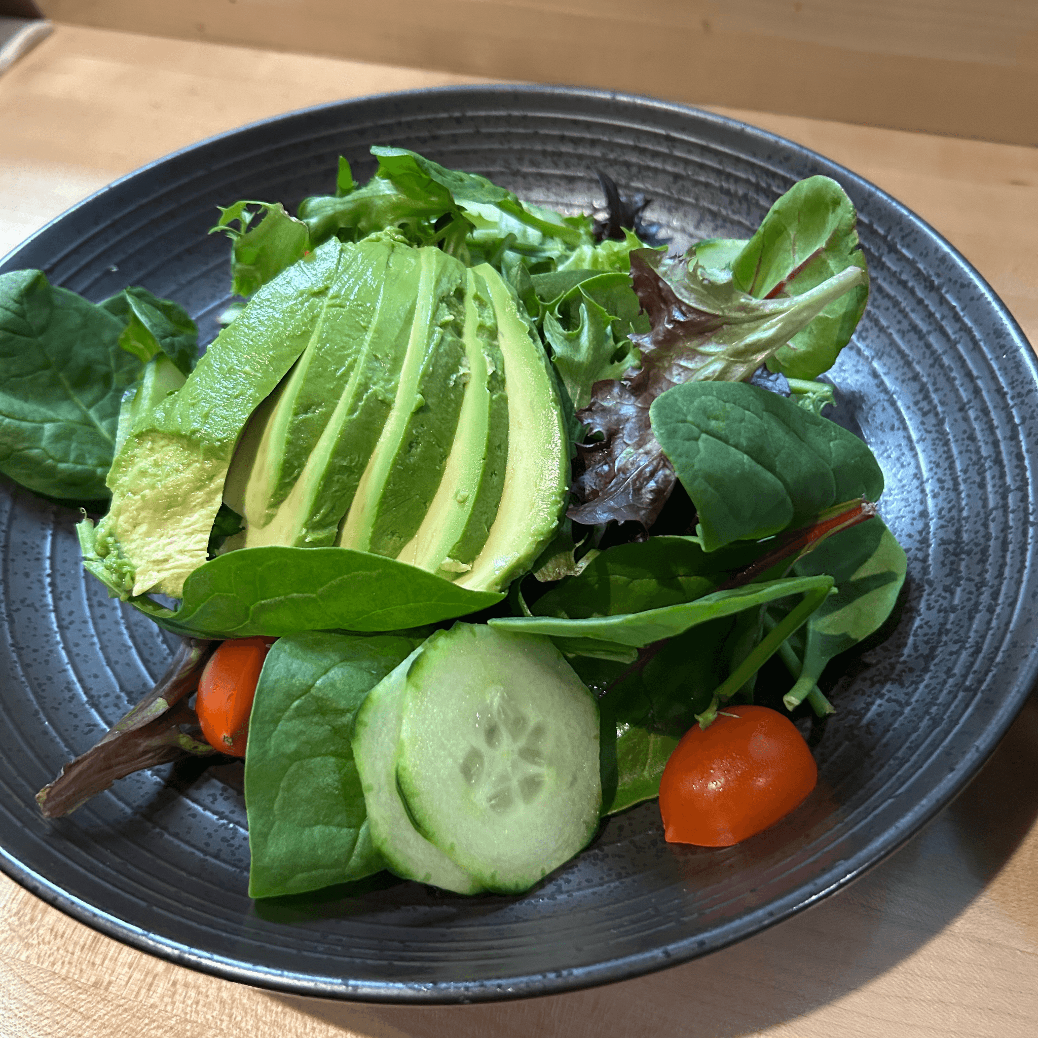 Mixed green, tomato, cucumber, avocado, and ginger dressing