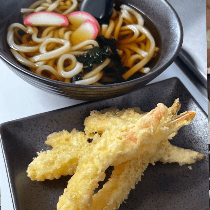 Udon noodle in a rich dashi broth, shrimp tempura, sweet potato tempura