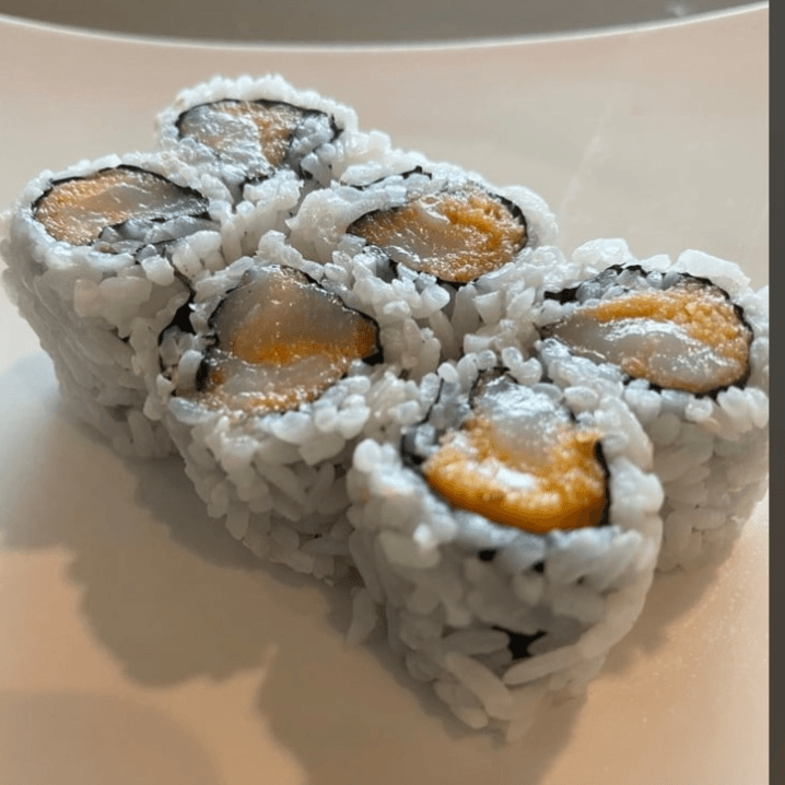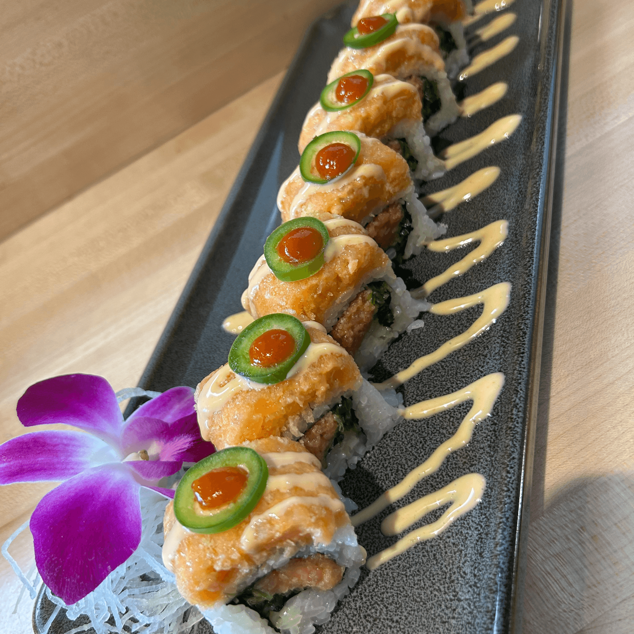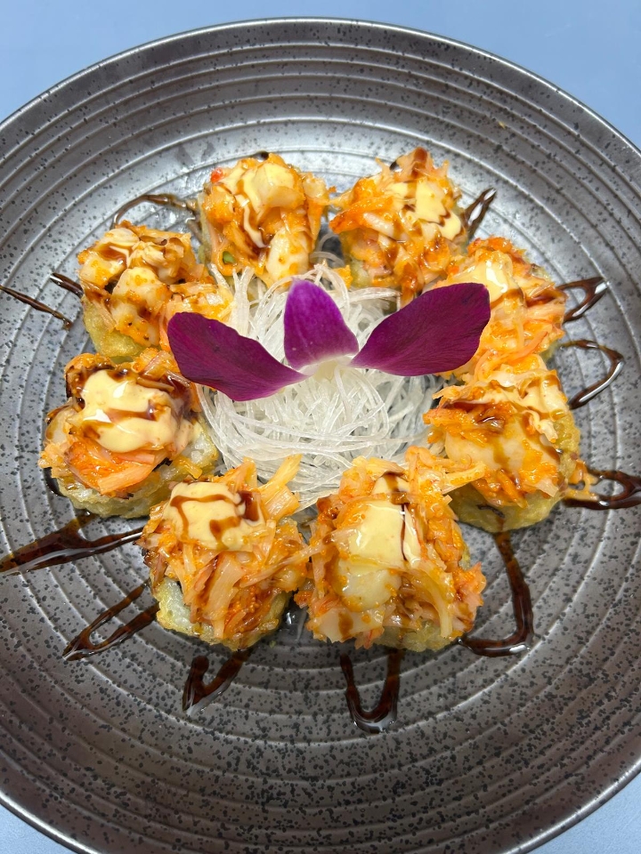 Deep-fried, shrimp tempura, asparagus, cucumber, avocado, kani, scallop, tobiko, and spicy mayo