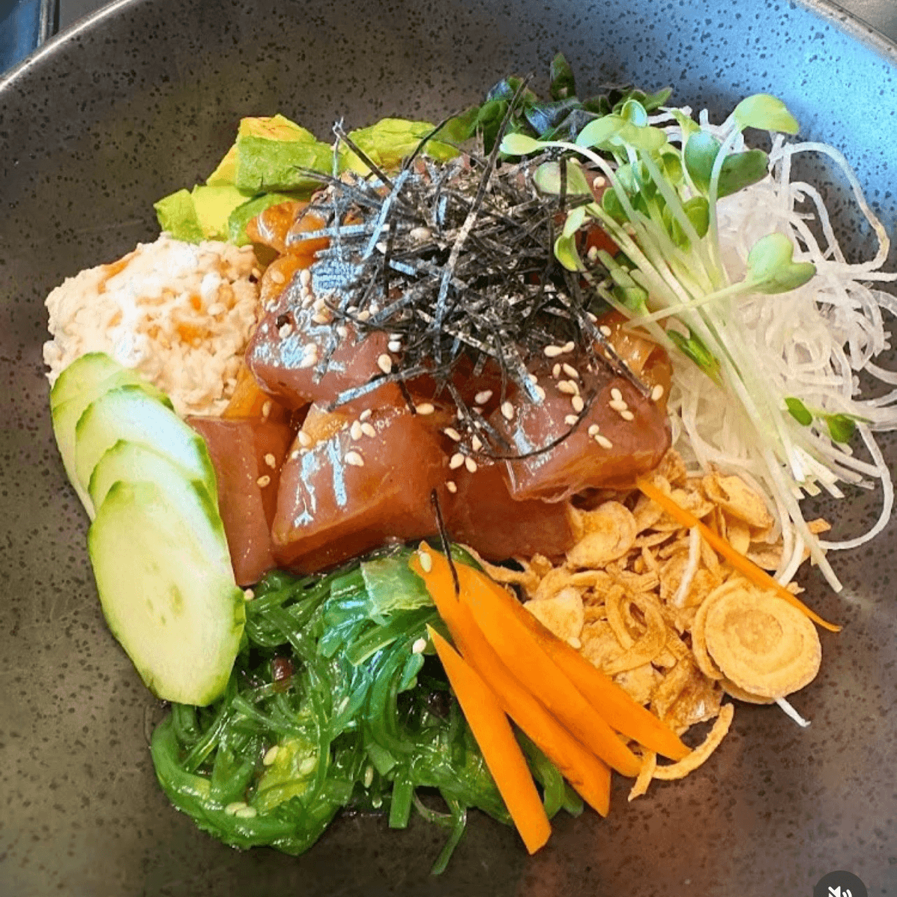 Salmon, Tuna, Kani, Avocado, Cucumber, Seaweed Salad, Wasabi dressing over sushi rice