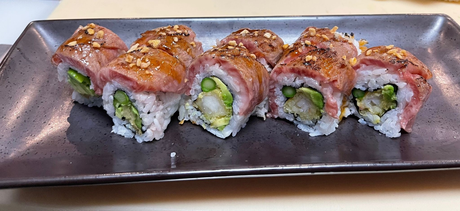 Shrimp tempura, avocado, asparagus, seared A5 wagyu, crispy garlic and miso BBQ sauce
