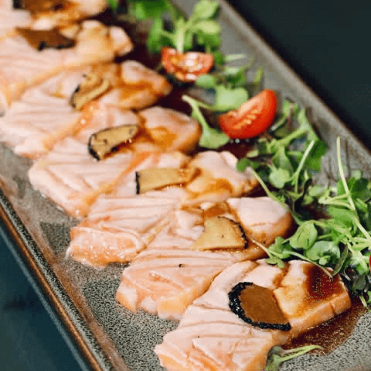 Seared salmon, truffle oil, truffle, and wasabi soy