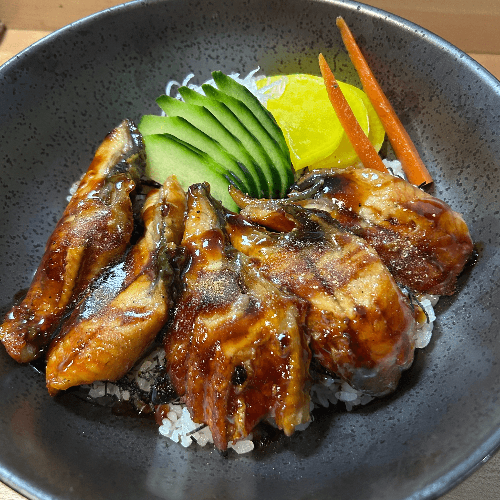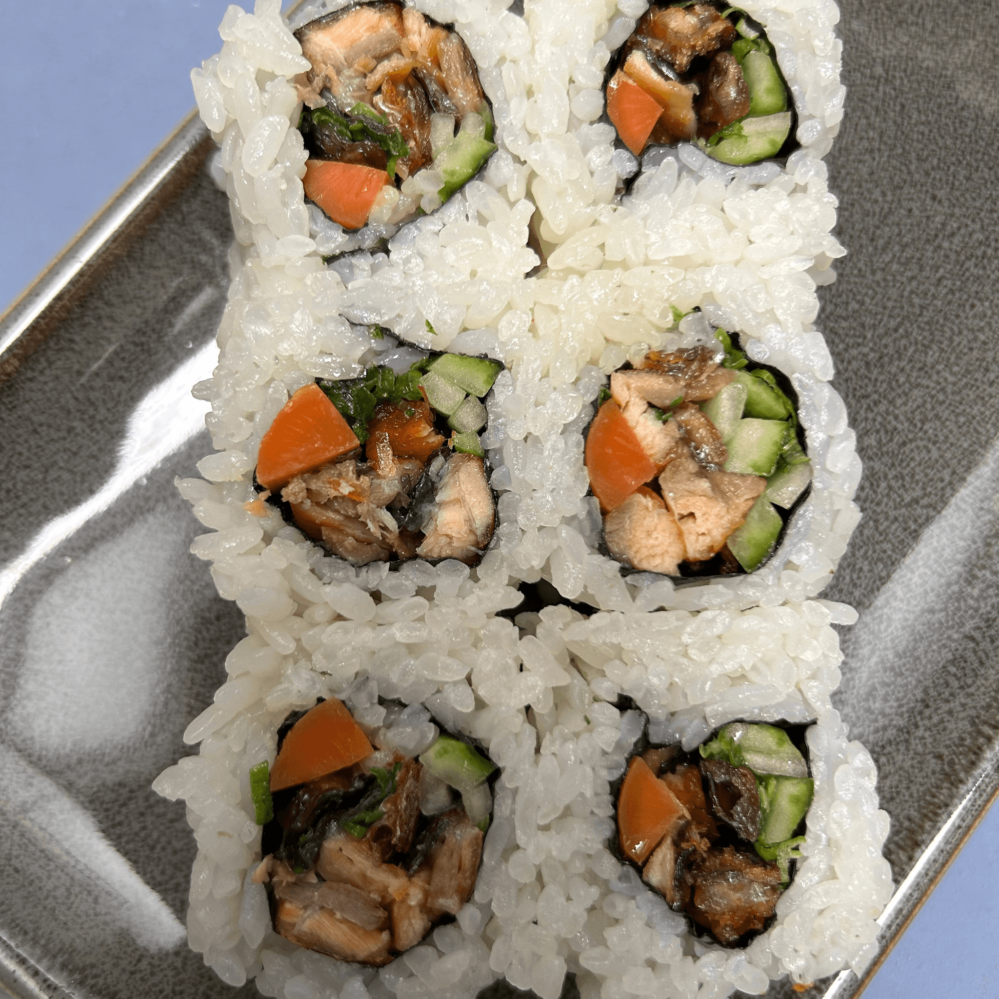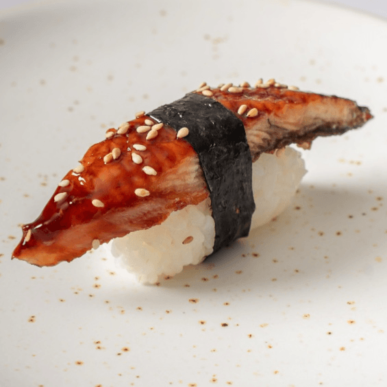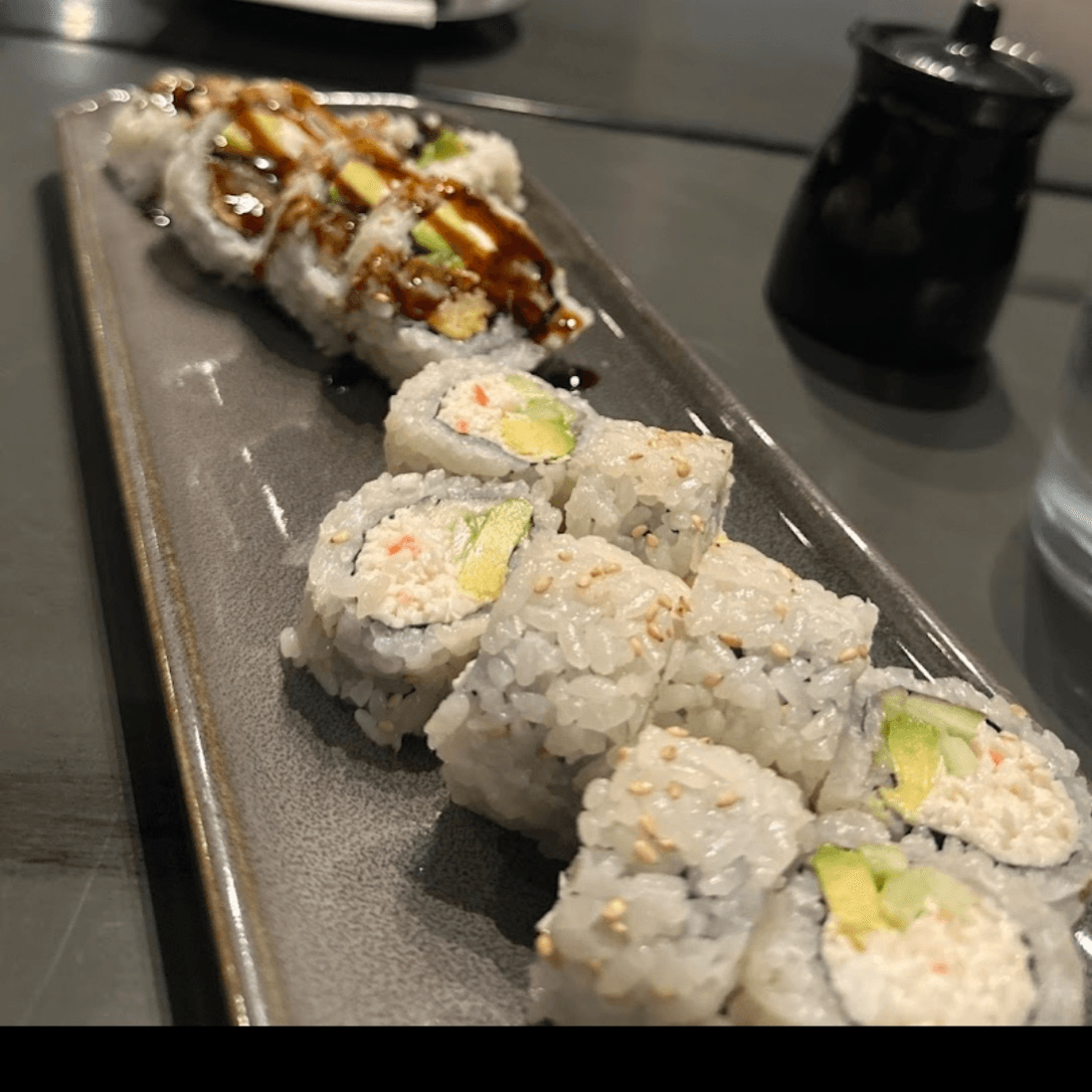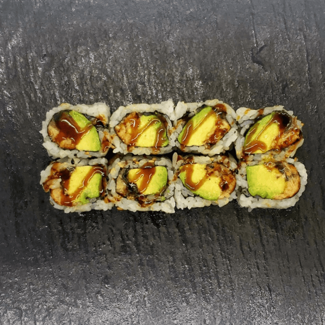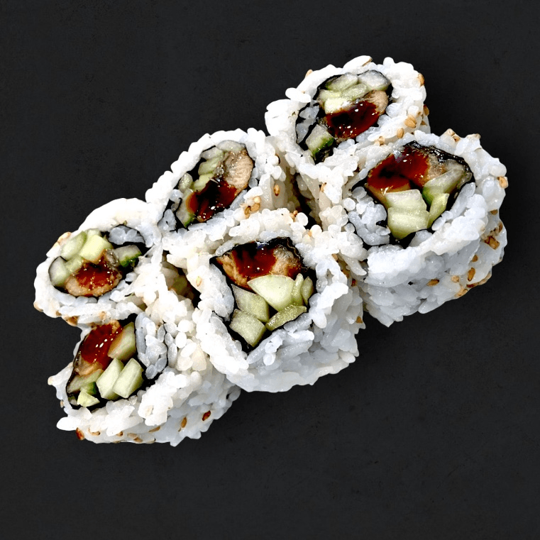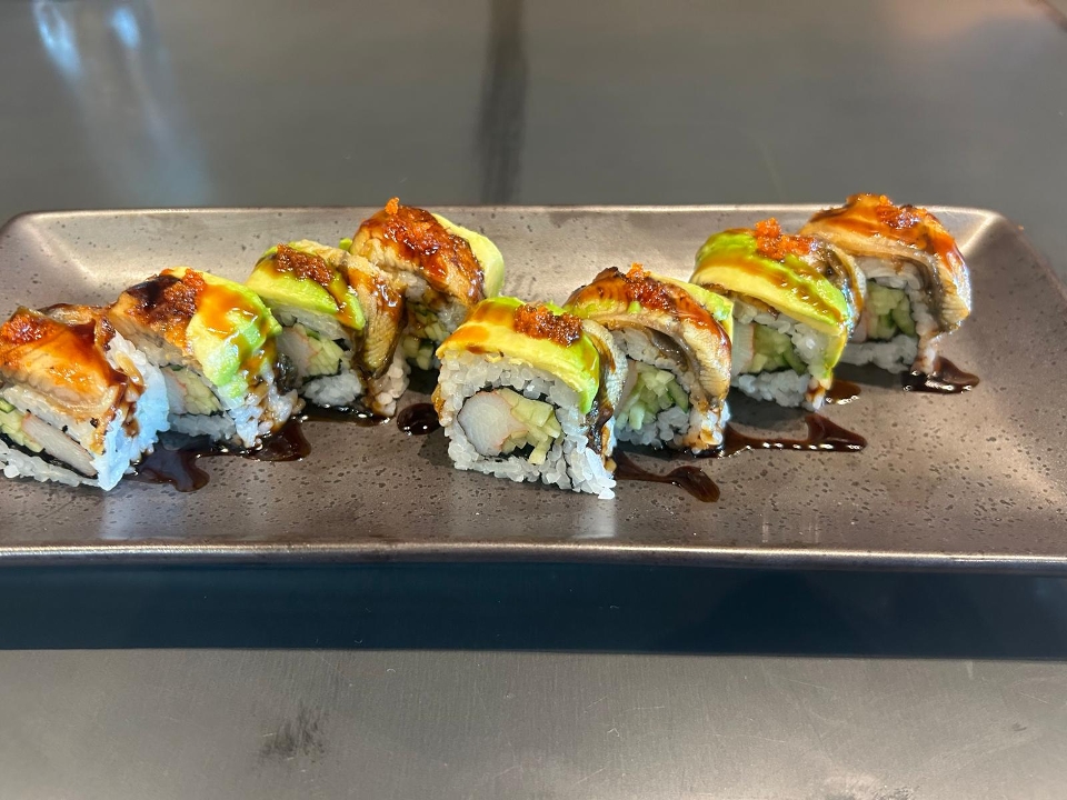 Eel, avocado, masago, kani, cucumber, and eel sauce