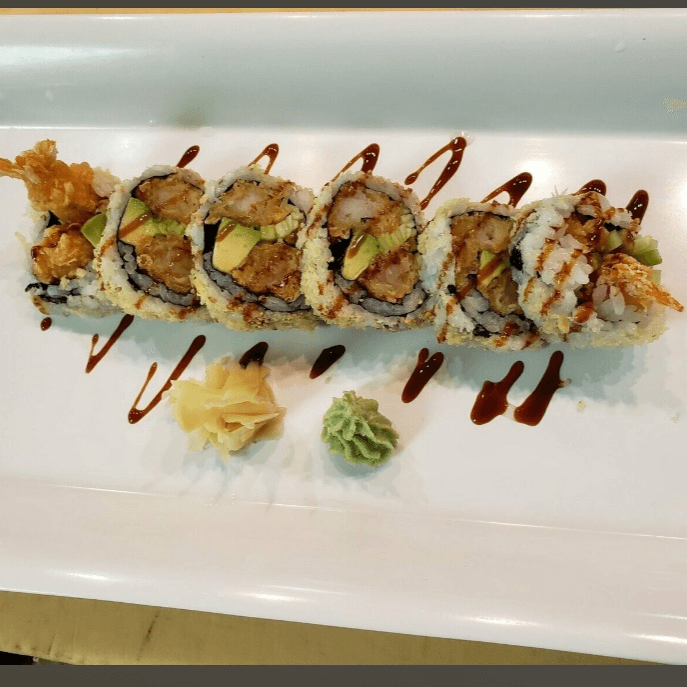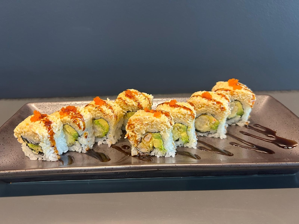 Shrimp tempura, avocado, spicy kani, eel sauce, and masago