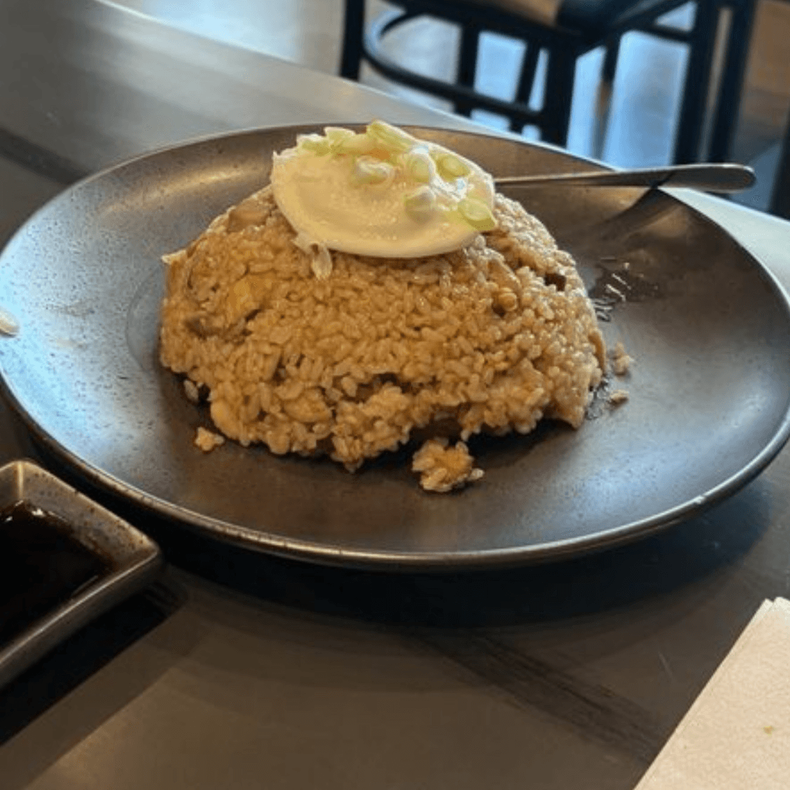 Wild mushroom fried rice with runny egg on a hot skillet