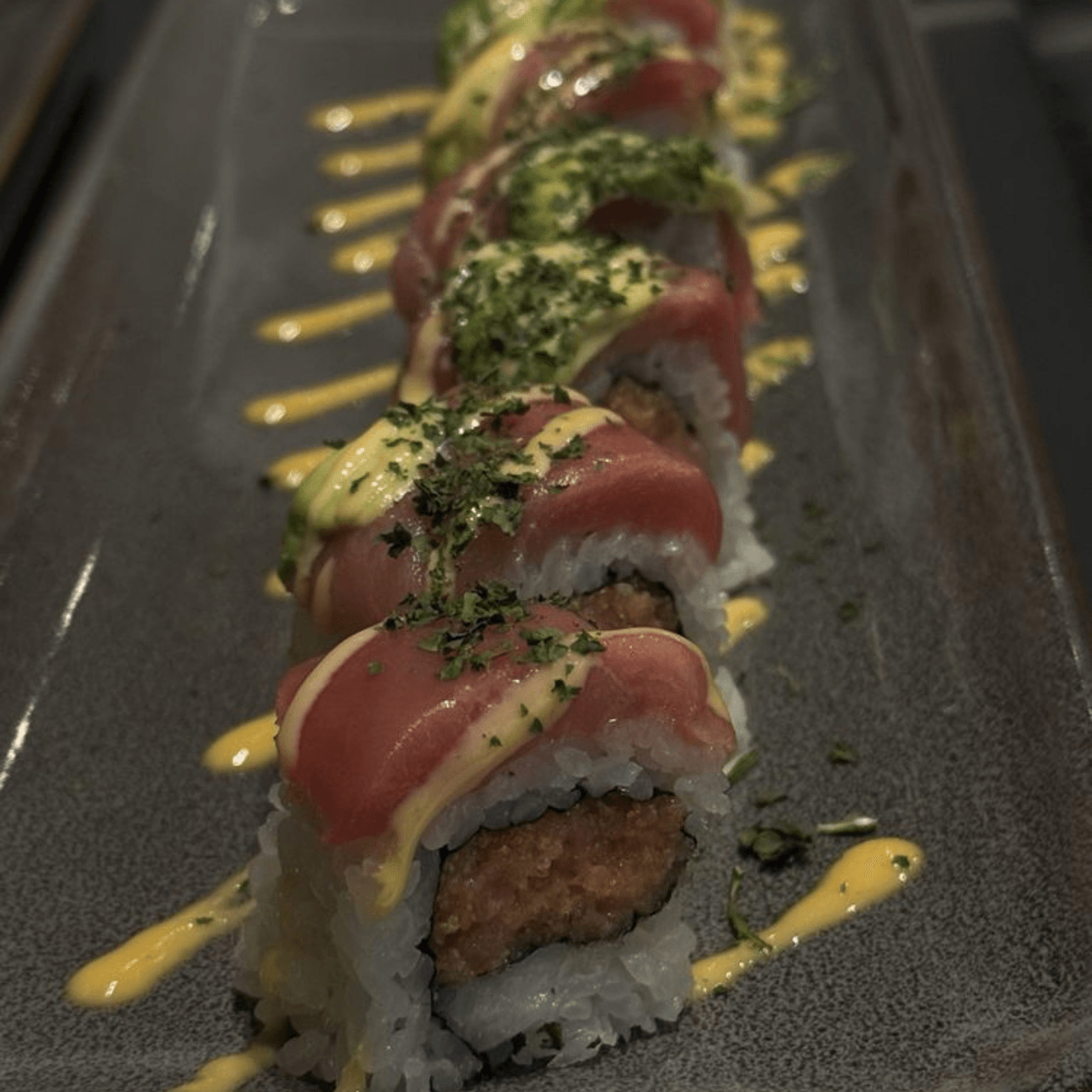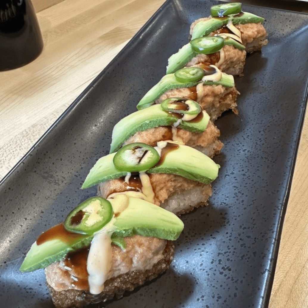 Crunchy spicy tuna, tuna, avocado, spicy mayo, and crispy kale