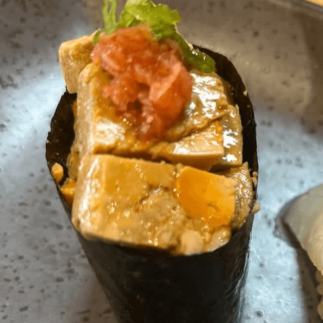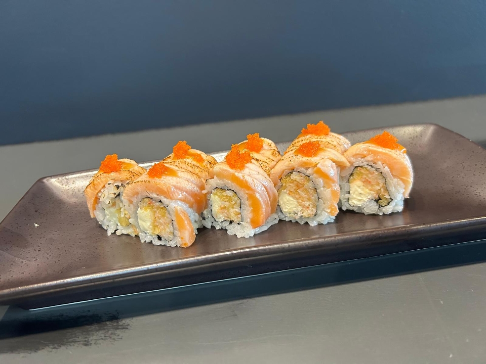 Spicy crunchy kani, cream cheese, seared salmon, masago and miso sauce