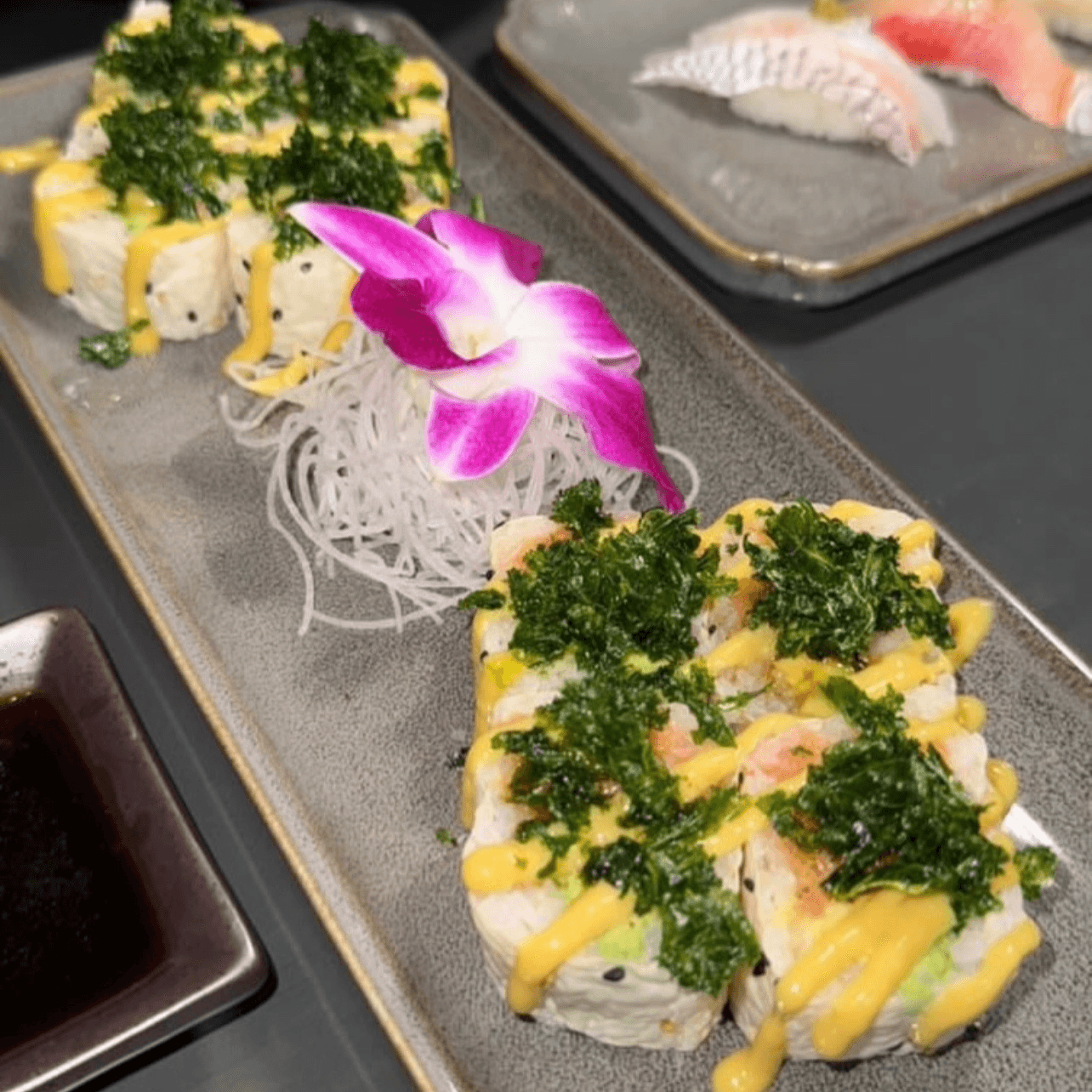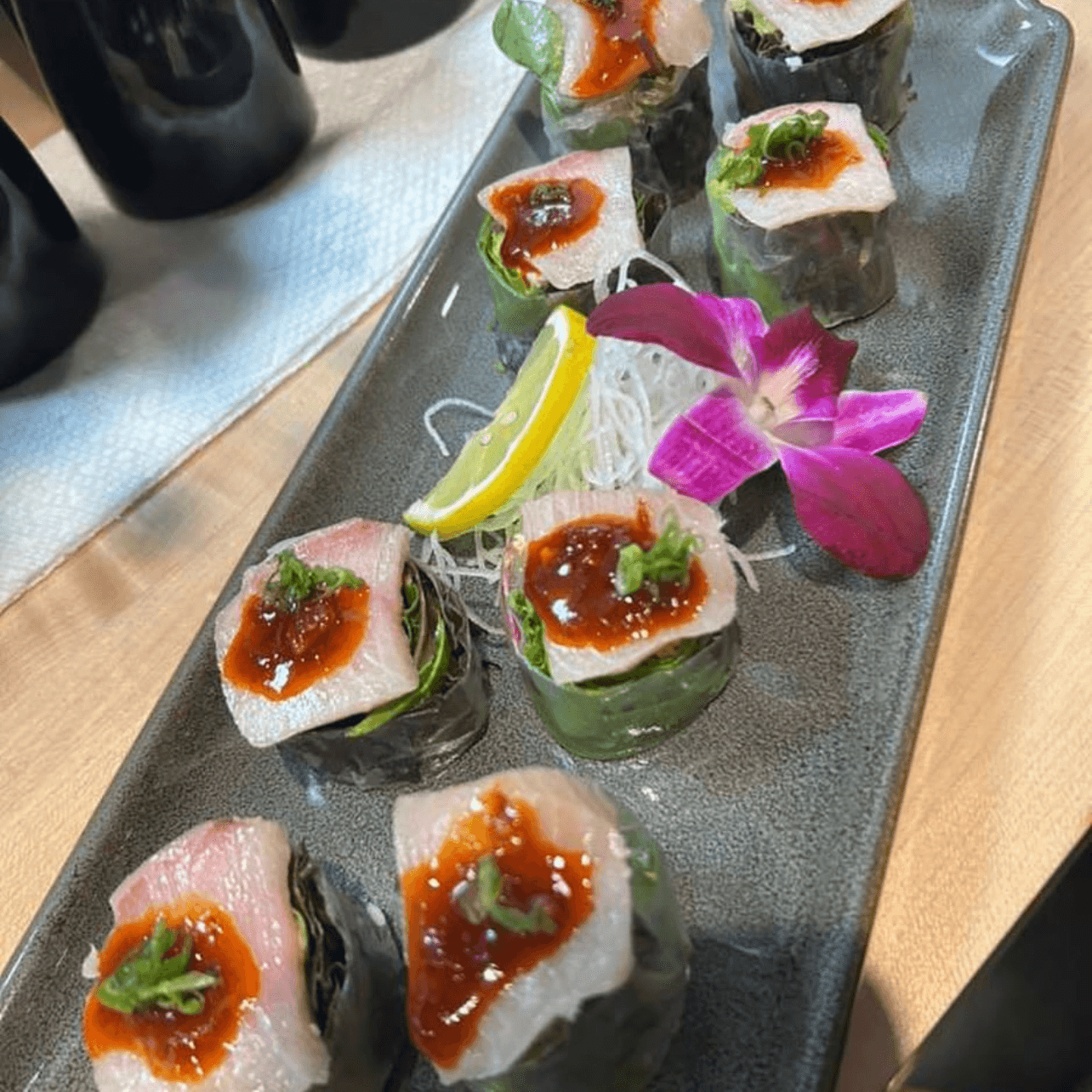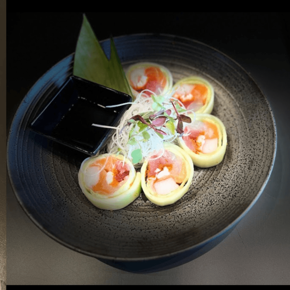 Spring mix, spicy kanikama, yamagobo, avocado wrapped in rice paper with yellowtail on top and chili ponzu garlic sauce (no rice)
