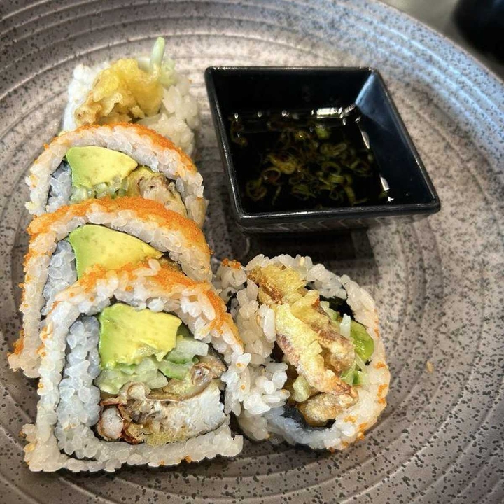Crispy soft shell crab, avocado, cucumber, masago, eel sauce