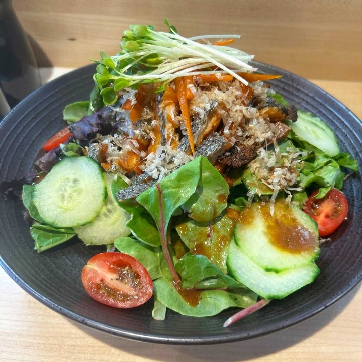Crispy salmon skin over mixed green with sesame dressing
