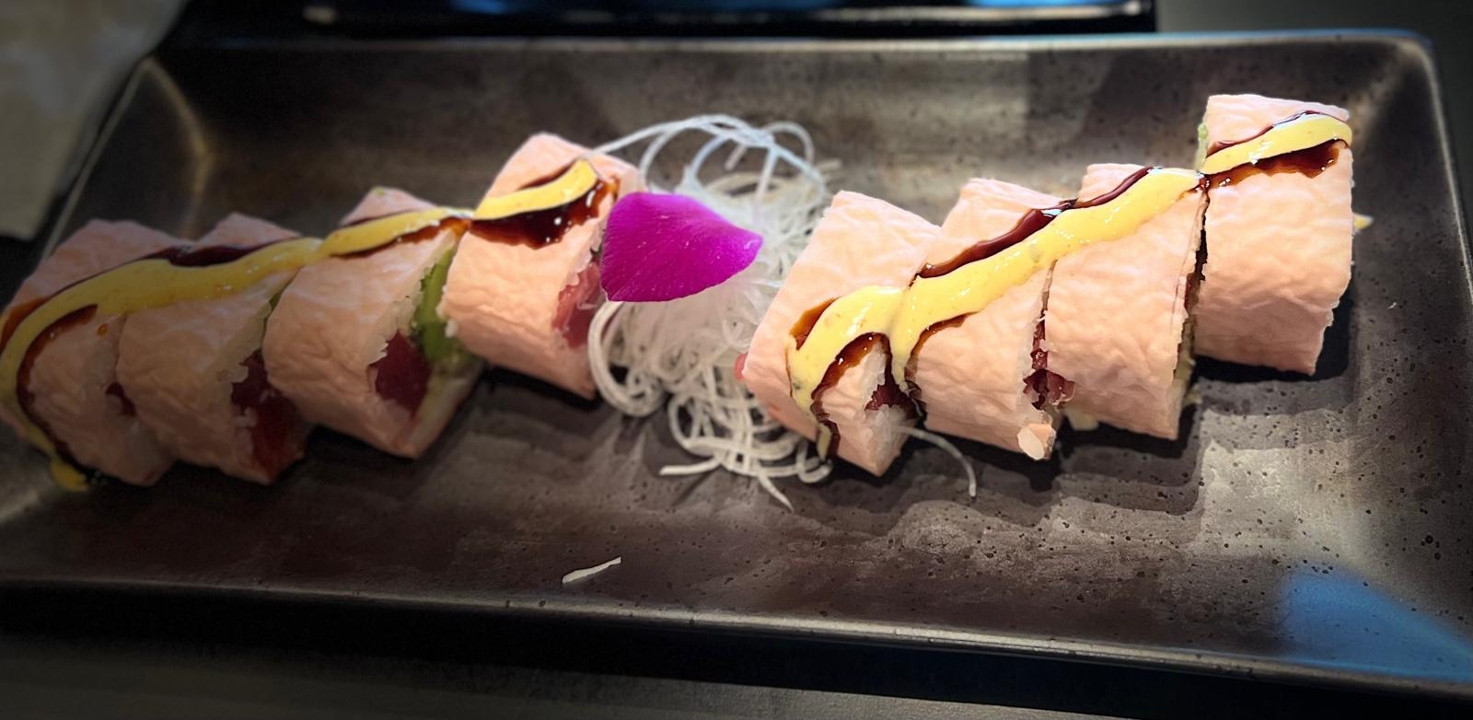 Tuna, avocado, cucumber, crunchy, spicy mayo, eel sauce, and pink soy wrap paper
