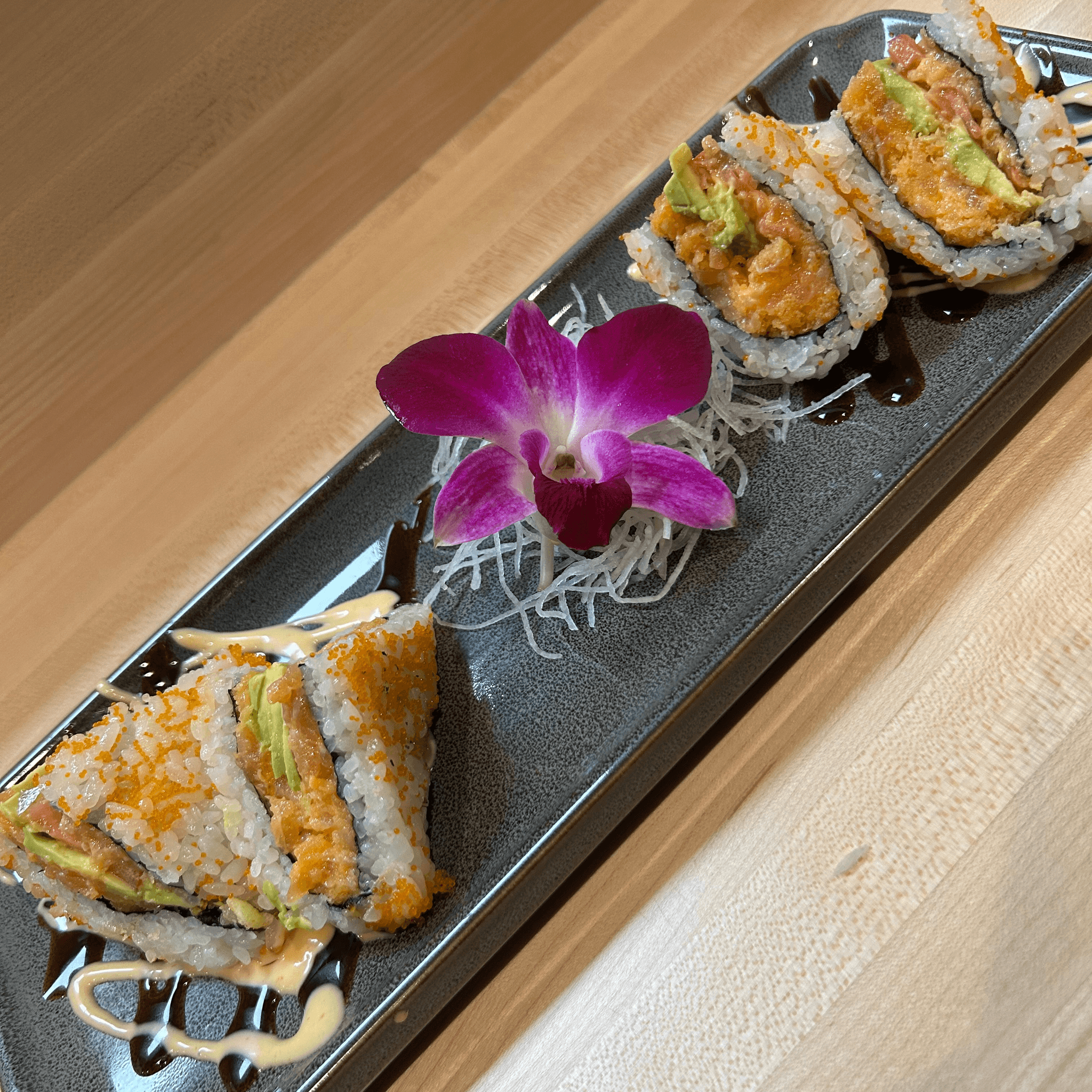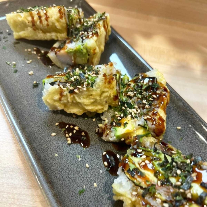Deep fried roll with kani, avocado, furikake, sesame seeds, eel sauce