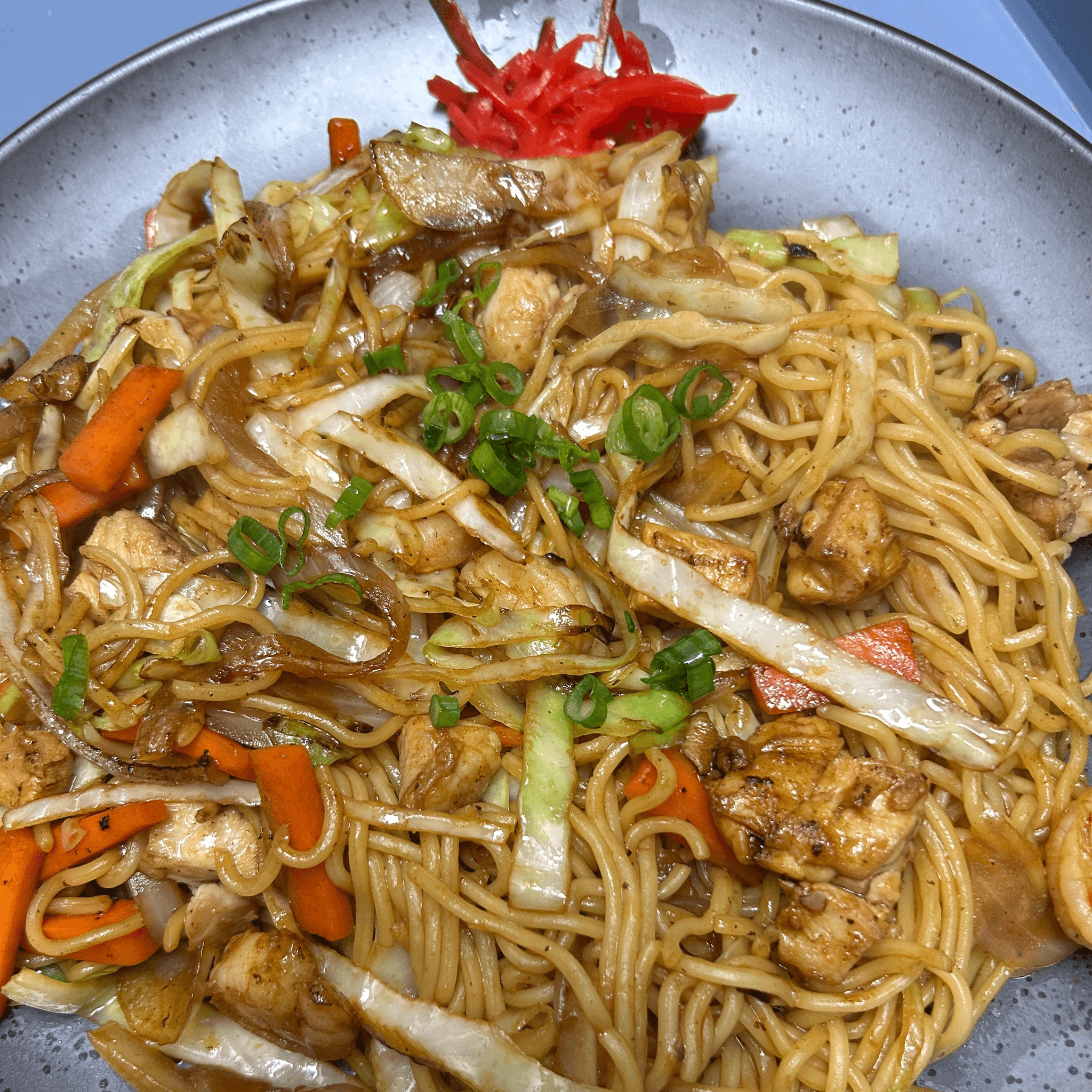 Stir-fried Japanese noodle with onion, cabbage, and carrot
