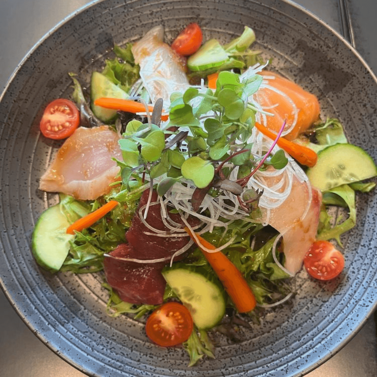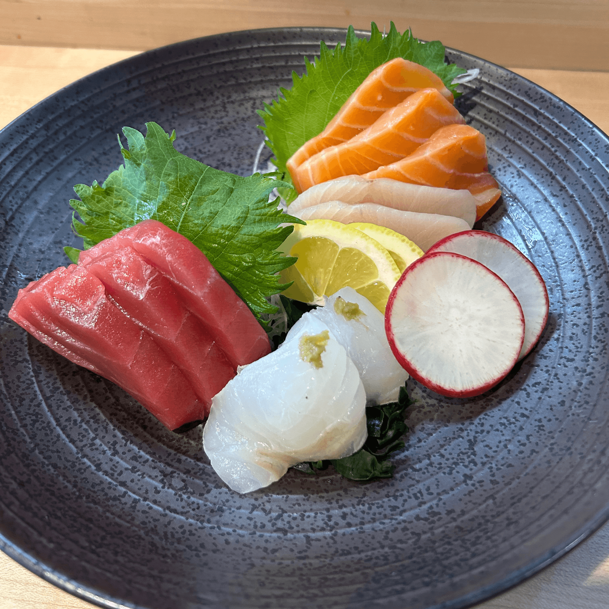 Assorted sashimi, mixed green, and onion soy dressing