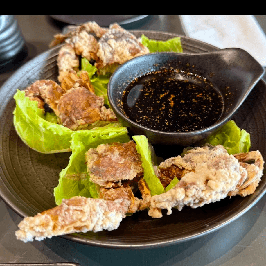 Crispy soft shell crab, mixed green, spicy ponzu sauce on the side